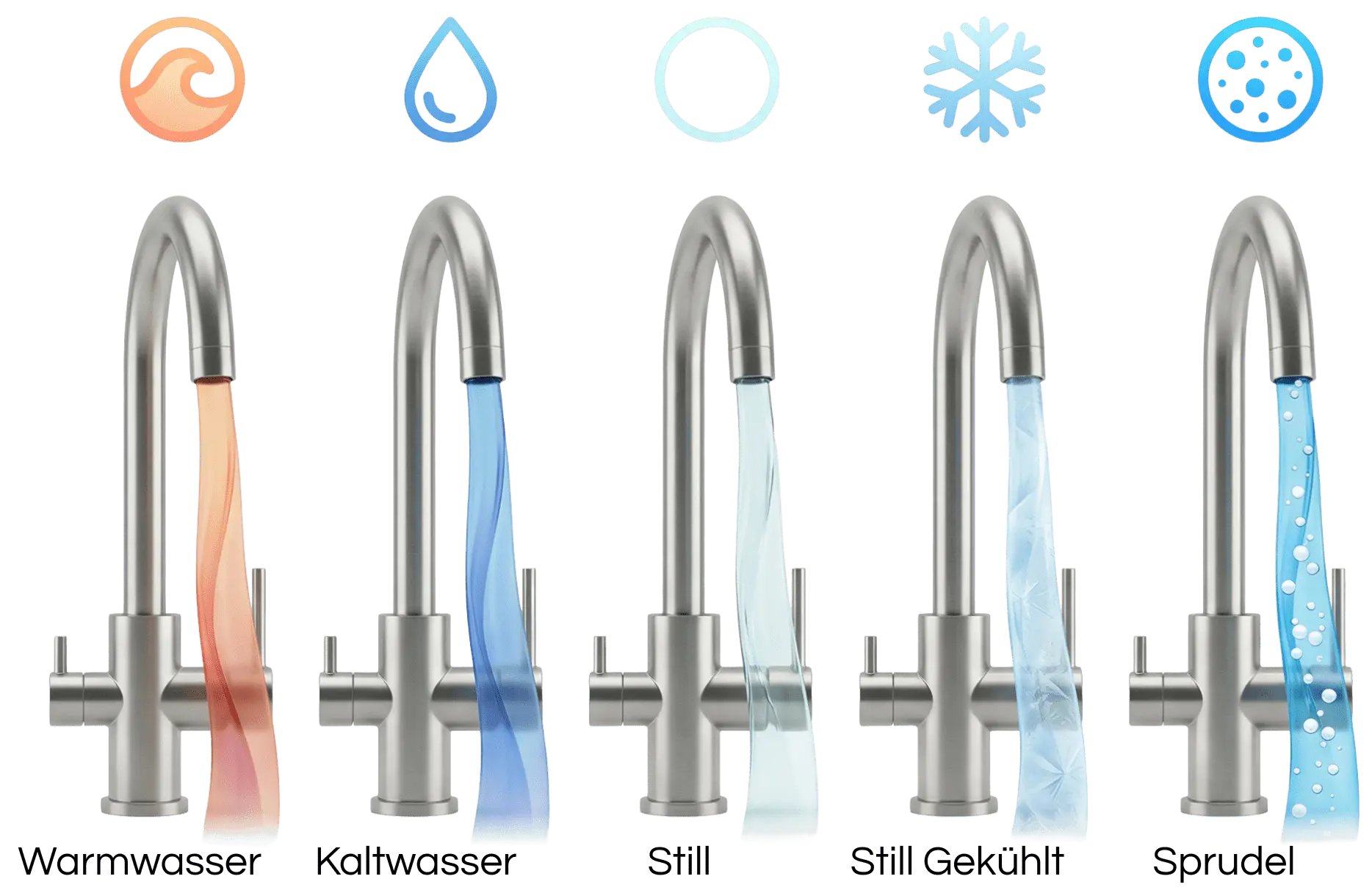 Sprudelwasser, stilles oder gefiltertes Wasser werden nicht durch die Armatur selbst erzeugt, sondern über ein separat angeschlossenes Wassersprudel- oder Filtersystem bereitgestellt.