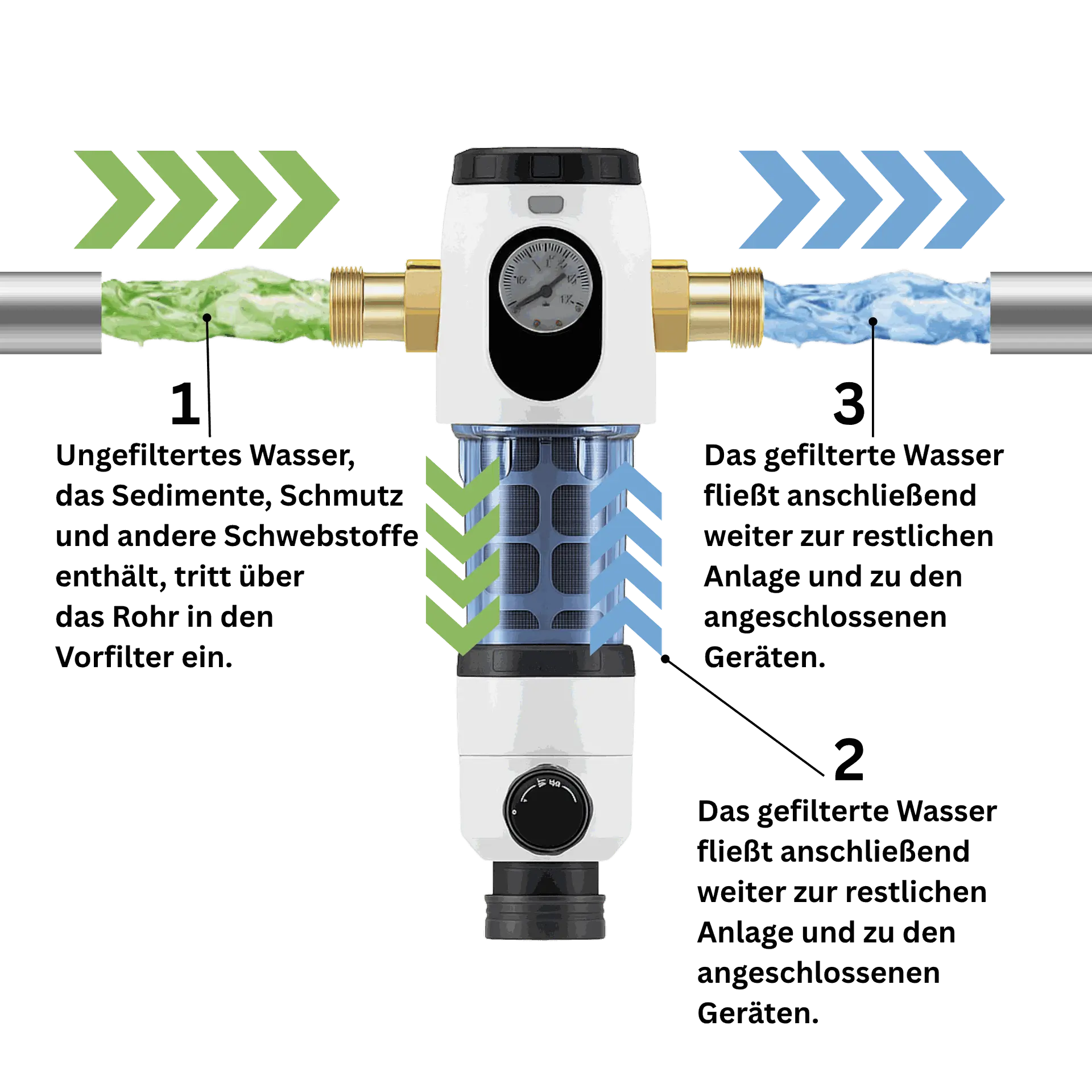 Entfernt zuverlässig Sand, Rost, Kalkpartikel und Sedimente aus dem Leitungswasser.