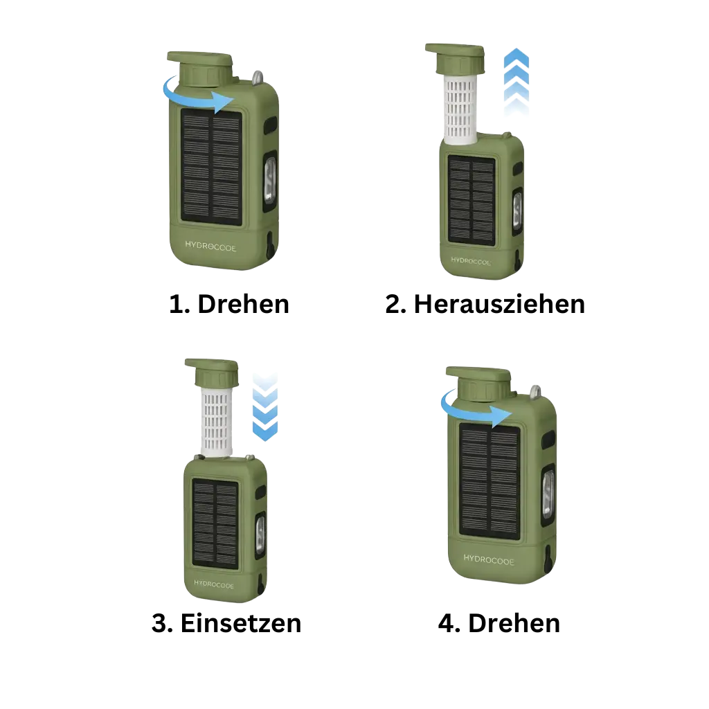 Sauberes Trinkwasser auf Knopfdruck – immer und überall. Der HYDROSOLVE SolarPro kombiniert ein hocheffizientes 0,01 µm-Filtersystem mit Solar-, USB- und Handkurbelbetrieb. Er entfernt zuverlässig Bakterien, Mikroplastik und Schadstoffe aus natürlichen Wasserquellen und versorgt dich dank integriertem 3000 mAh Akku gleichzeitig als Powerbank für Smartphone, GPS & Licht. Ideal für Camping, Wandern, Reisen und Notfälle.